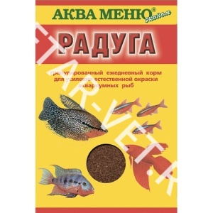 РАДУГА» — экструдированный ежедневный корм для усиления естественной окраски. Предназначен для большинства видов аквариумных рыб: живородящих, цихлид, харациновых, лабиринтовых, карповых, различных сомов и других рыб длиной 2-10 см. Отличительная особенность этого корма — добавка натурального стимулятора, улучшающего общее состояние рыб и окраску их тела. Корм «Радуга» полезно 1-2 раза в неделю чередовать с кормом «Флора»