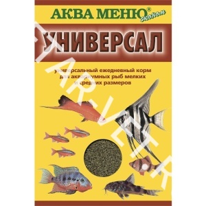 «УНИВЕРСАЛ» — универсальный ежедневный корм для большинства видов аквариумных рыб: живородящих, цихлид, харациновых, лабиринтовых, карповых, различных сомов и других рыб длиной 2-8 см.