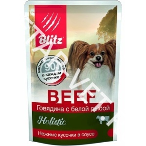 Каждый пёс – яркая индивидуальность, со своими вкусами и привычками. Кому-то больше нравится птица, кому-то – мясо или рыба. А есть питомцы, которые стремятся попробовать сразу всё и хотят самое лучшее! Именно для таких гурманов мы и создали влажный корм в паучах – «Говядина с белой рыбой». Консервы Blitz Holistic Beef & White Fish Adult Dog Small Breeds in Gravy (нежные кусочки в соусе) разработаны для собак мелких пород, вступивших во взрослый возраст. В каждом кусочке – до 90% мясных ингредиентов, рыбий жир, чуть-чуть клетчатки, полезной для пищеварения и всё, ни зерна, ни крахмала!
