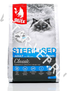 Blitz Sterilised Cats Chicken — это полнорационный сухой корм класса суперпремиум, разработанный с учётом потребностей стерилизованных кошек и кастрированных котов. Рацион тщательно сбалансирован по всем макро- и микроэлементам и подходит для постоянного кормления животных. Единственное, о чём следует позаботиться владельцу, — это свежая вода. Blitz Sterilised содержит оптимальное количество белка и при этом чуть меньше жира, чем другие корма «Блиц» для взрослых кошек. Он идеально подойдёт питомцам после стерилизации, а также малоподвижным кошкам, склонным к набору веса.