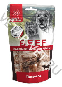 Для приготовления сублимированного лакомства Blitz для собак используется говяжий пищевод, или, как ещё называют этот субпродукт — пикальное мясо, представляющее собой пластинки мышечной ткани, внутри которых находится аппетитная мягкая жилка. Для вашей собаки — это настоящий изысканный деликатес, который не только доставит ей огромное удовольствие, но и принесёт большую пользу.