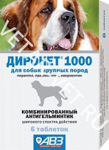 Диронет® 1000 обладает широким спектром нематодоцидного и цестодоцидного действия, активен в отношении круглых и ленточных гельминтов, паразитирующих у собак и кошек, в т. ч. Toxocara canis, Т. cati, Toxascaris leonina, Uncinaria stenocephala, Ancylostoma caninum, Trichuris vulpis, Echinococcus granulosus, E. multilocularis, Diphyllobothrium latum, Dipylidium caninum, Multiceps multiceps, Taenia spp., а также личиночных фаз развития (микрофилярий) Dirofilaria immitis и Dirofilaria repens.