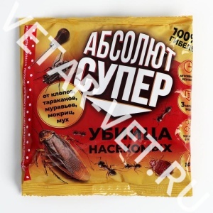 Предназначен для уничтожения тараканов, муравьев, блох, мух, клопов, сверчков, мокриц, уховерток, чешуйниц и крысиных клещей в любых сухих помещениях, включая жилые. Характеристика: инсектицидное средство в форме дуста (порошка). Традиционное средство борьбы с насекомыми. В состав дуста входят 3 действующих вещества из разных химических групп, усиливающих действие друг друга и позволяющих эффективно уничтожать насекомых, устойчивых к другим средствам. Структура средства разработана с тем, чтобы уменьшить пыление препарата и увеличить его прилипаемость к вертикальным поверхностям. Насекомые погибают через несколько часов после непосредственного контакта с поверхностью, на которую был нанесен 'Абсолют дуст супер'. Эффективность после проведения обработки наблюдается уже через 1-2 дня после применения. Не удаляя дуст в скрытых местах, можно обеспечить длительное остаточное действие до 2 месяцев.