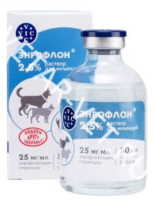 VIC Энрофлон 2,5% 50 мл - раствор для инъекций для лечения бронхопневмонии, колибактериоза, сальмонеллеза и других заболеваний телят, ягнят и поросят, вызванных микроорганизмами, чувствительными к фторхинолонам; для лечения атрофического ринита, энзоотической пневмонии, синдрома мастит-метрит-агалактия у свиней.ЭНРОФЛОН 2,5%, 10% раствор для инъекций содержит в 1 мл в качестве действующего вещества соответственно 25, 100 мг энрофлоксацина. ЭНРОФЛОН 2,5%, 10% производят в форме стерильного прозрачного раствора слегка желтоватого цвета в стеклянных флаконах по 10, 50 мл.