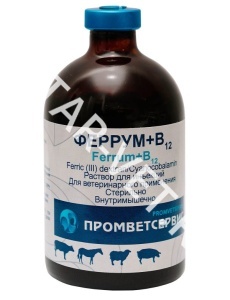 В 1,0 мл препарата содержится 100 мг комплексно связанного железа (Ш), 4 мкг витамина В12 (цианокобаламин) и вода для инъекций. Феррум+В12 применяют для лечения и профилактики железодефицитных анемий у животных.