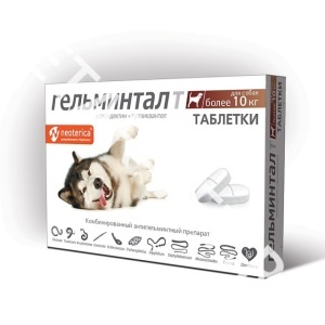 Выпускают Гельминтал Т для собак более 10 кг, расфасованным по 2 таблетки в блистеры, которые упакованы в картонные пачки вместе с инструкцией по применению.