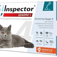 Инспектор Квадро К назначают кошкам для лечения и профилактики энтомозов, отодектоза, нотоэдроза, акарозов, вызываемых иксодовыми клещами, нематодозов желудочно-кишечного тракта (токсокароз, токсаскаридоз, унцинариоз, анкилостомоз), цестодозах (тениидозы, дипилидиозе, мезоцестоидозах, дифиллоботриозах), а также в целях профилактики дирофиляриоза.