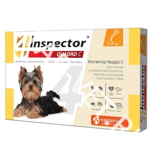 Инспектор Квадро С назначают собакам для лечения и профилактики энтомозов, демодекоза, отодектоза, саркоптоза, акарозов, вызываемых иксодовыми клещами, нематодозов желудочно-кишечного тракта (токсокароз, токсаскаридоз, унцинариоз, анкилостомоз, трихоцефалез), цестодозов (тениидозы, дипилидиоз, эхинококкоз, дифиллоботриоз, мезоцестоидоз), ассоциативных нематодо-цестодозных инвазий, а также в целях профилактики дирофиляриоза.