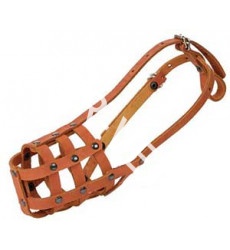 Намордник кожаный,  короткий. Подходит для породы: кокер спаниель. Размер: диаметр 25 см./ глубина 5,5см. Выполнен из плотных кожаных полос закреплены между собой хольнитенами. Фурнитура: две регулируемых металлических пряжки. Имеется петля для закрепления намордника на ошейнике. Такой намордник долговечный и комфортный для ношения собакой. В нем можно находится длительное время и в жару и в холод.