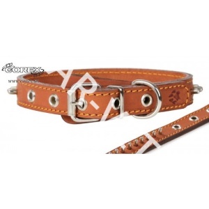 Ошейник кожаный, двухслойный, прошитый. Ширина: 20мм. Длина: L1 - 31см. И L2 — 43см.  Украшенный металлической фурнитурой с оригинальным тиснением.  Выполнен из высококачественной кожи. Торцы ошейника обработаны по специальной технологии с нанесением краски для защиты кожи от влаги. Прошивка по всему периметру предотвращает деформацию и усиливает прочность ошейника, играет декоративную роль. Фурнитура: металлическая пряжка с полукольцом для поводка и кожаным отбойником (отбойник предохраняет шерсть от попадания в пряжку), заведено под ошейник и закреплено хольнитенами. Цвет кожи: черный, коричневый, рыжий. Производитель оставляет за собой право вносить изменения в конструкцию изделия, не ухудшающие его технические характеристики.