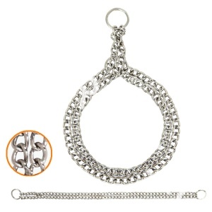 Двухрядный металлический ошейник-удавка, затягивающийся при натяжении поводка. Служит для дрессировки с целью усиления воздействия при рывках. Не перетирает шерсть. Выбирать длину цепочки нужно так, чтобы у собаки при надевании ошейника проходила голова, но не слишком свободно, чтобы он самопроизвольно не слетал и собака его не потеряла при наклоне головы или в прыжке. Диаметр проволоки - 3мм, длина - 600мм.