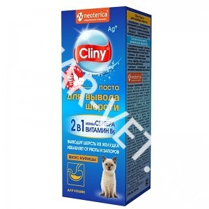 Паста для вывода шерсти Cliny способствует естественному выведению комков шерсти (безоаров) из желудка животных. Избавляет кошек от рвоты, потери аппетита, закупорки кишечника, запоров. Обладает привлекательным для кошек вкусом курицы.