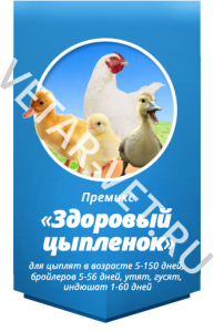 Премикс предназначен для обогащения комбикормов, белково-витаминно-минеральных концентратов и кормовых смесей витаминами, макро- и микроэлементами для цыплят в возрасте 5-150 дней, бройлеров 5-56 дней, утят, гусят, индюшат