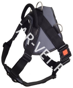 Шлейка снабжена удобной ручкой, регулирующимися ремнями и тремя стальными кольцам.