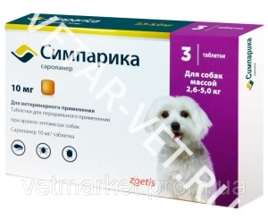 Симпарика 10 мг д/соб 2,5-5 кг, уп 3 табл