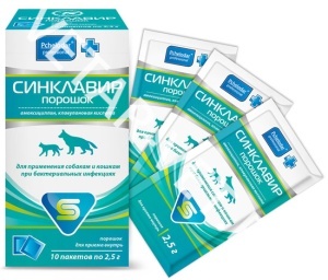 Лекарственный препарат Синклавир порошок для собак и кошек содержит в 1 г в качестве действующих веществ: амоксициллина тригидрат - 115 мг (в пересчете на амоксициллин - 100 мг), калия клавуланат - 29,5 мг (в пересчете на клавулановую кислоту - 25 мг).