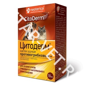 Цитодерм капли ушные противогрибковые + применяют для лечения у собак и кошек острого, хронического, первичного и вторичного отитов наружного и среднего уха грибковой и бактериальной этиологии.
