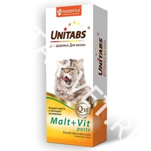 Юнитабс Мальт+Вит паста применяется для выведения комков шерсти у кошек, а также для поддержания иммунитета, нормализации обмена веществ и улучшения состояния кожи и шерсти у кошек.Задают с кормом или в чистом виде непосредственно из тюбика. Применяют перорально, ежедневно из расчета 1 г пасты на 1 кг массы животного, что соответствует 2 – 2,5 см полоски пасты из тюбика. Эту дозу можно распределить в течение дня. Паста должна быть комнатной температуры. Курс применения не ограничен.